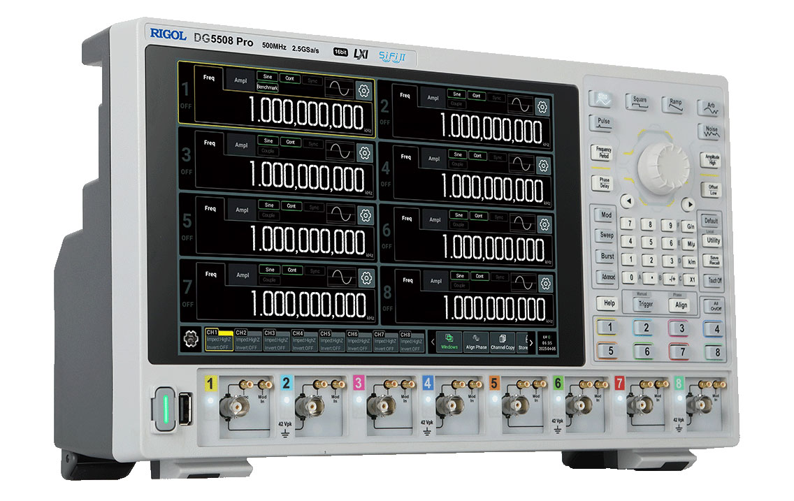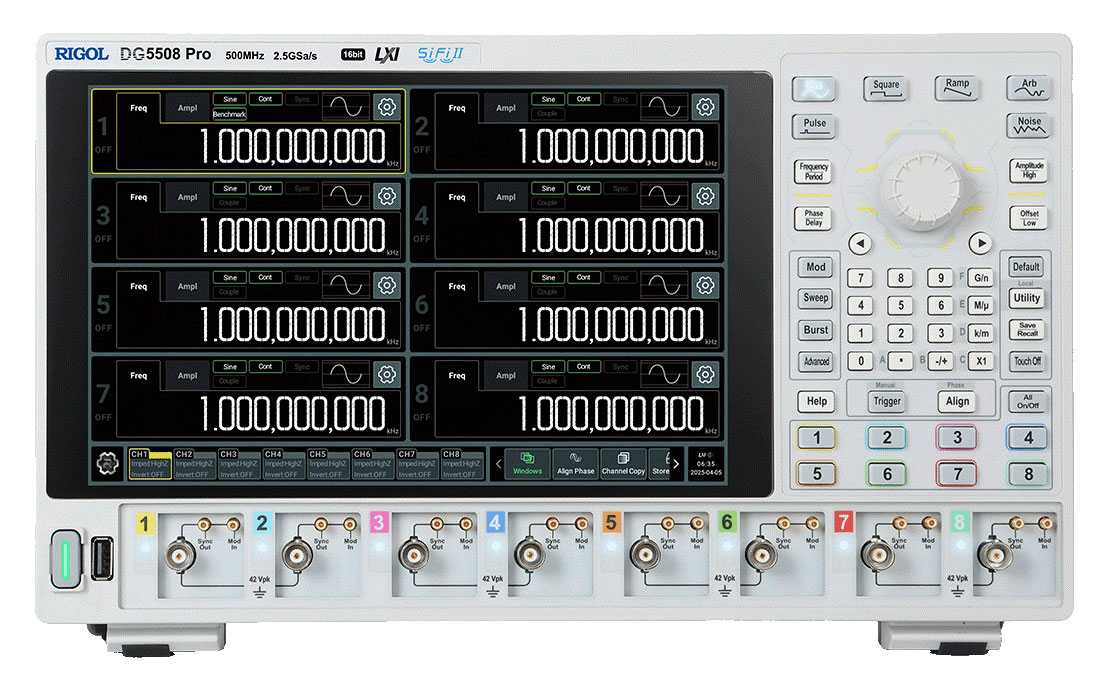 DG5508 Pro – генератор сигналов произвольной формы. Это представитель нового поколения генераторов сигналов RIGOL с изолированными каналами. Изделие собрано на технологической платформе Si-Fi II, обеспечивает максимальную частоту дискретизации 2.5 Гвыб/с, выходную частоту синусоидального сигнала 500 МГц, вертикальное разрешение 16 бит, имеет ряд новых функциональных возможностей для удовлетворения потребностей в различных отраслях и сценариях применения. 4 изолированных канала.