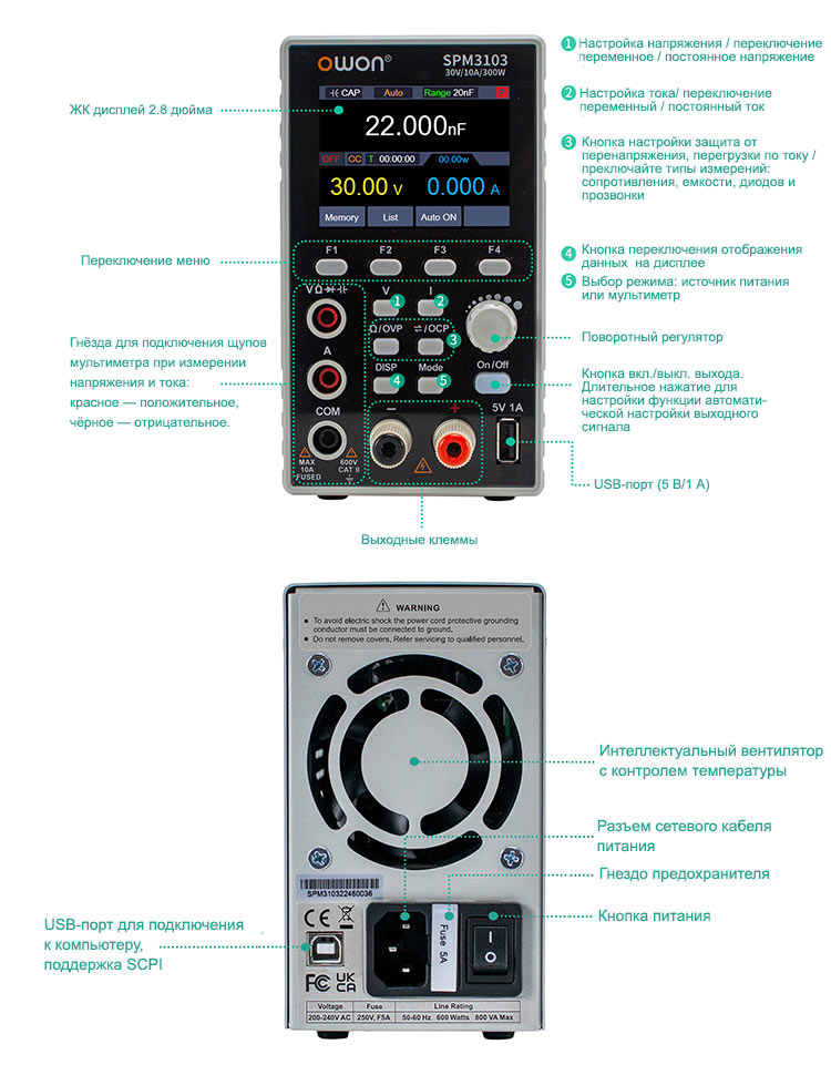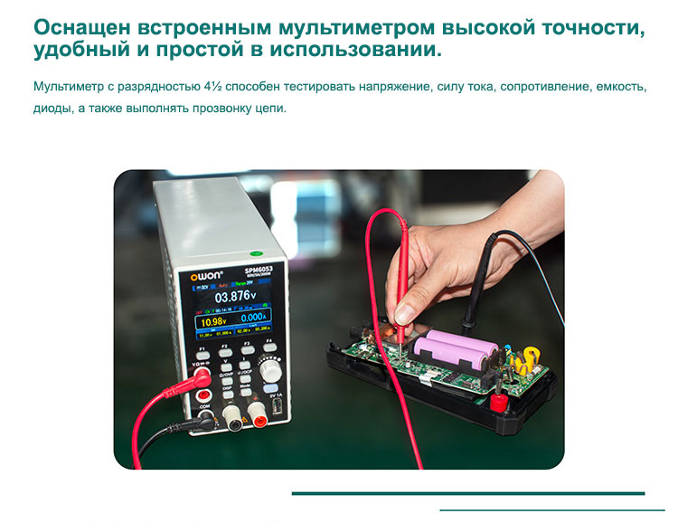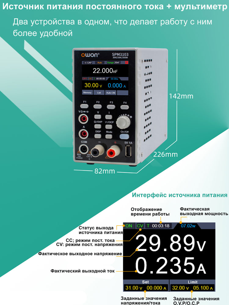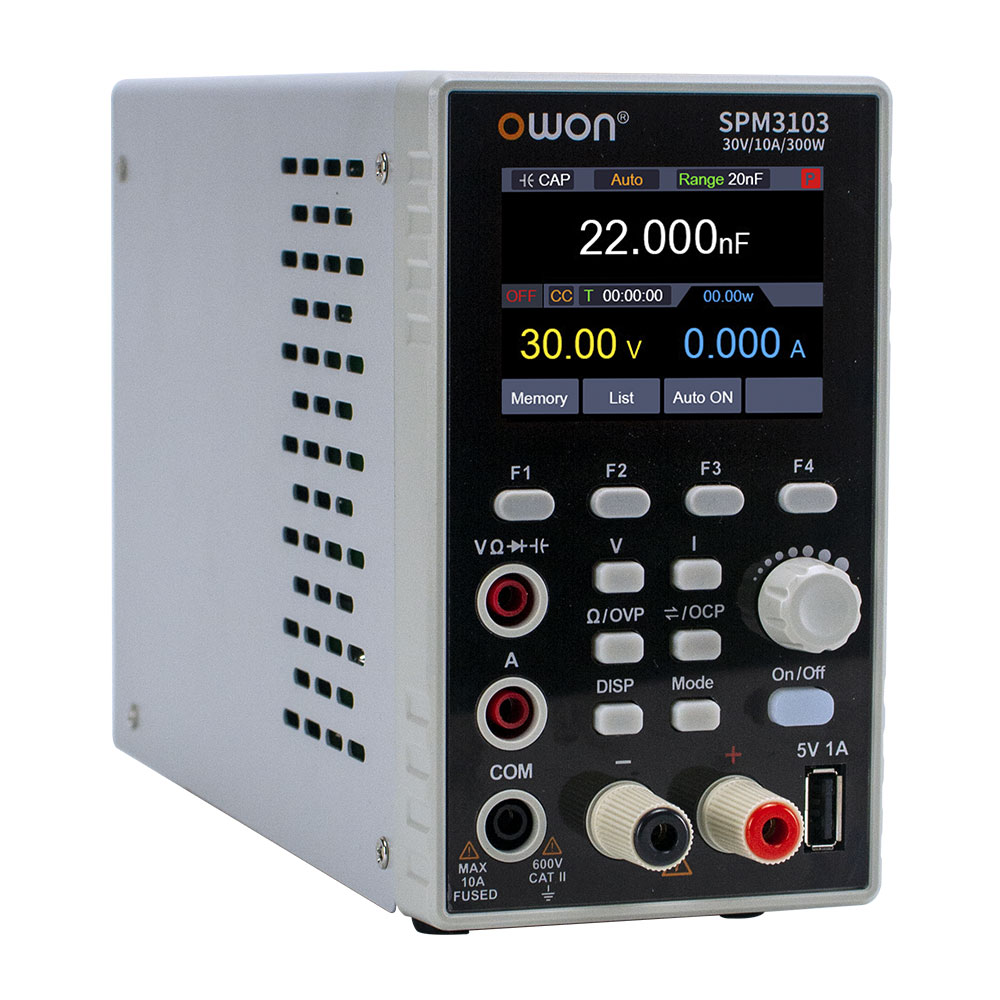 OWON SPM3103 - это одноканальный,программируемый, лабораторный, импульсный источник питания постоянного тока, c электрической мощностью 300 Вт, со встроенным цифровым мультиметром и выполненный в компактном корпусе.