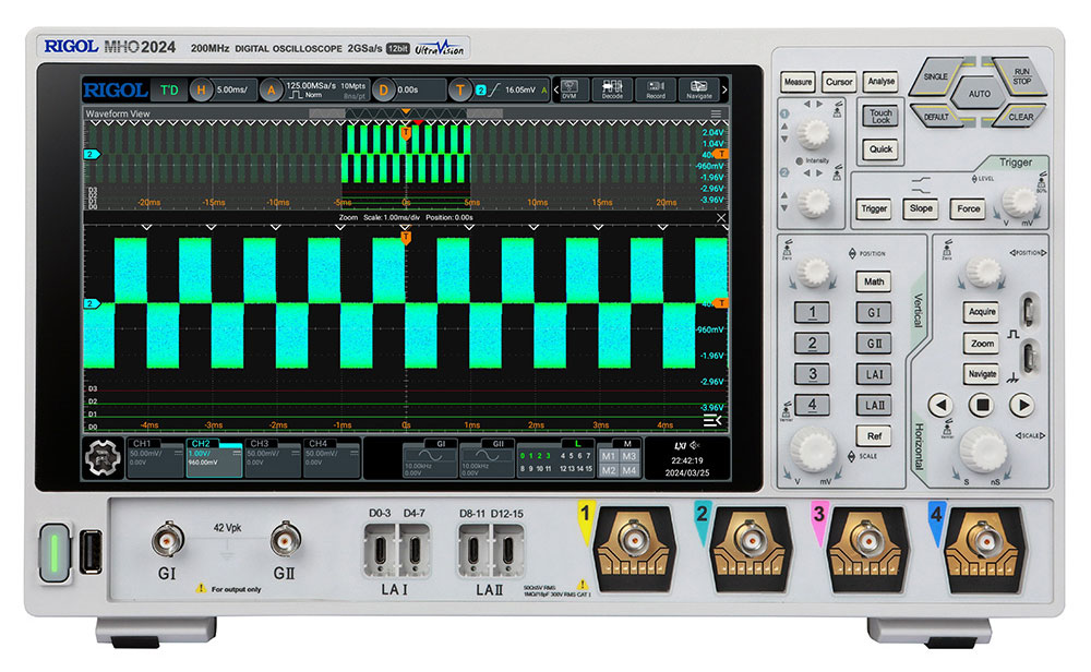 Цифровой осциллограф RIGOL MHO2024 – 4-х канальный осциллограф высокого разрешения (12 бит) с полосой пропускания 200 МГц, выполненный в компактном корпусе, с возможностью работы от автономного источника питания. MHO2024 построен на технологической платформе «Centaurus», собственной разработки компании RIGOL.