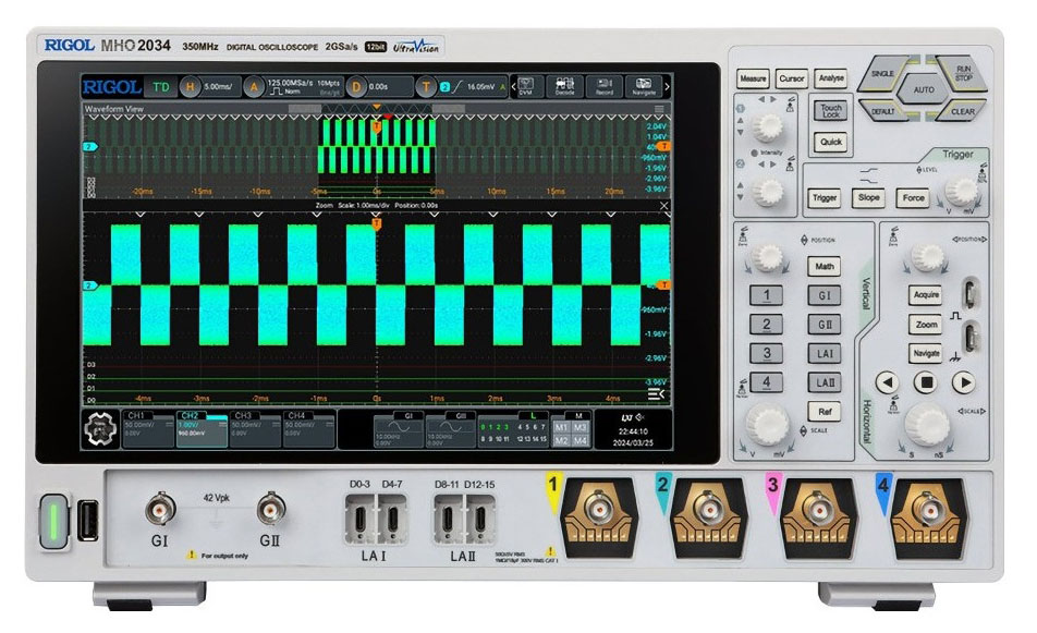 Цифровой осциллограф RIGOL MHO2034 – 4-х канальный осциллограф высокого разрешения (12 бит) с полосой пропускания 350 МГц, выполненный в компактном корпусе, с возможностью работы от автономного источника питания. MHO2034 построен на технологической платформе «Centaurus», собственной разработки компании RIGOL.