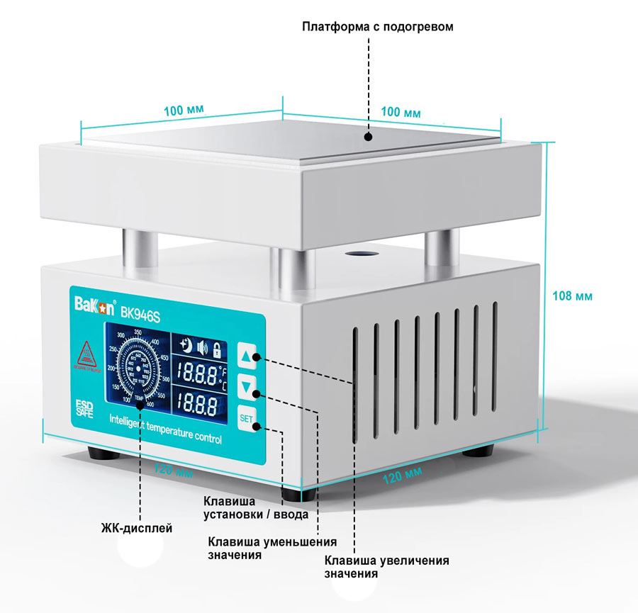 | Размеры термостола Bakon BK946S | 120 (Д)*120 (Ш)*108 (В) мм |