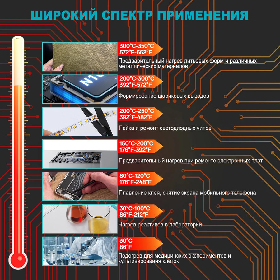 - Ремонт шариковых выводов BGA, особенно подходит для демонтажа BGA крупных размеров.