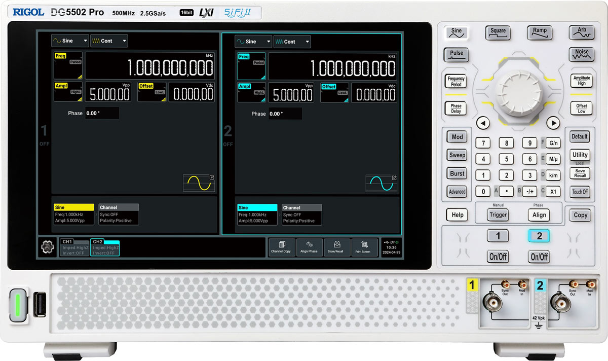 Генератор сигналов произвольной формы DG5502 Pro — это представитель нового поколения генераторов сигналов RIGOL с изолированными каналами. Изделие собрано на технологической платформе Si-Fi II, обеспечивает максимальную частоту дискретизации 2.5 Гвыб/с, выходную частоту синусоидального сигнала 500 МГц, вертикальное разрешение 16 бит, имеет ряд новых функциональных возможностей для удовлетворения потребностей в различных отраслях и сценариях применения.