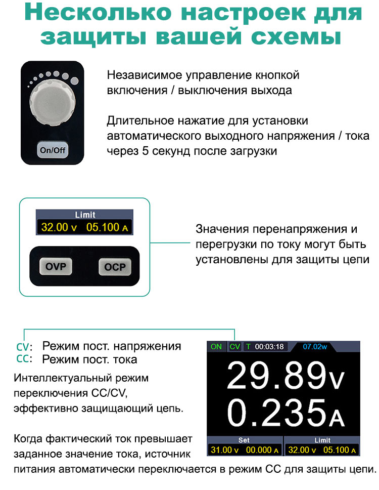 - Режимы работы: стабилизация тока, стабилизация напряжения;