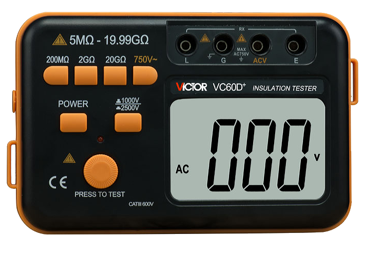 Этот цифровой измеритель сопротивления изоляции (мегаомметр) использует преобразование постоянного напряжения (12 В) в высокое постоянное напряжение 1000 В/2500 В и позволяет проверять состояние изоляции путем измерения микроамперного тока при подаче испытательного напряжения, аналогично традиционному мегомметру. В основе регистрирующей части прибора лежит АЦП с двойным интегрированием, дающий еще и дополнительную функцию измерения переменного напряжения. Этот портативный прибор имеет высокую нагрузочную способность, хорошую защищенность от влияния электрического поля, широкий диапазон измерения, наличие подсветки ЖК-дисплея, а наличие шейного ремня освобождает для работы обе руки. Надежность и высокое качество магаоометра Victor VC60D+ обеспечивают ему широкое применение для проверки коммерческой электросети, сопротивления изоляции электрооборудования, электроинструмента, кабелей и т.п.