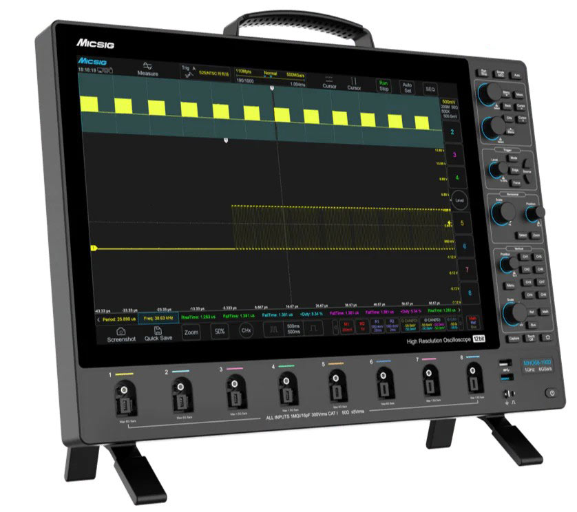 В осциллографах Micsig серии MHO 6 используется высокоточная технология 12-разрядного высокоскоростного АЦП с частотой дискретизации до 6 Гвыб./сек.. В сочетании с тщательной схемотехникой и передовыми методами обработки сигналов они обеспечивают всесторонний захват и стабильный анализ сигналов от слабых до высокоскоростных, обеспечивая надежную гарантию высокоточного тестирования в таких областях, как научные исследования, производство и образование. Максимальная аналоговая полоса пропускания в этой серии достигает 1 ГГц, что позволяет легко решать задачи тестирования самых современных устройств в области силовой электроники.