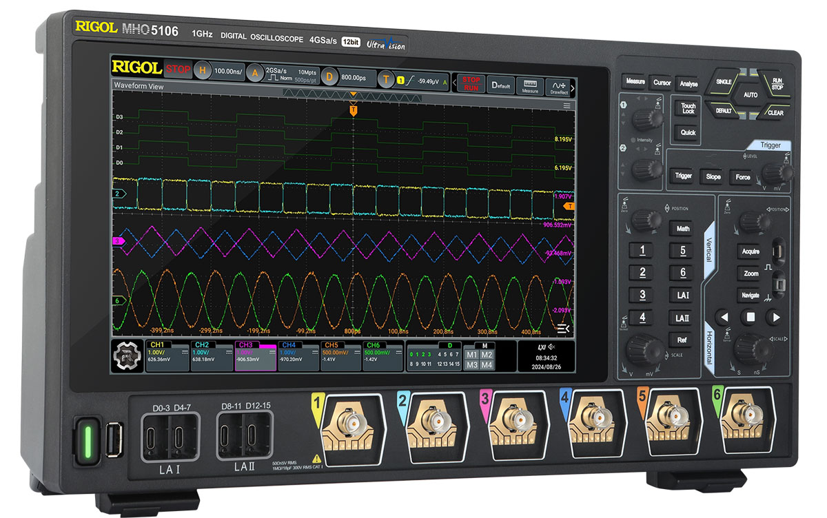 Цифровой осциллограф RIGOL MHO5106 – 6-ти канальный высокопроизводительный осциллограф высокого разрешения (12-бит) с полосой пропускания 1000 МГц, выполненный в компактном корпусе, с возможностью работы от источника автономного питания. MHO5106 построен на технологической платформе «Centaurus», собственной разработки RIGOL. RIGOL MHO5106 представляет собой комплексный инструмент, отвечающий практически всем потребностям в осциллографических измерениях.