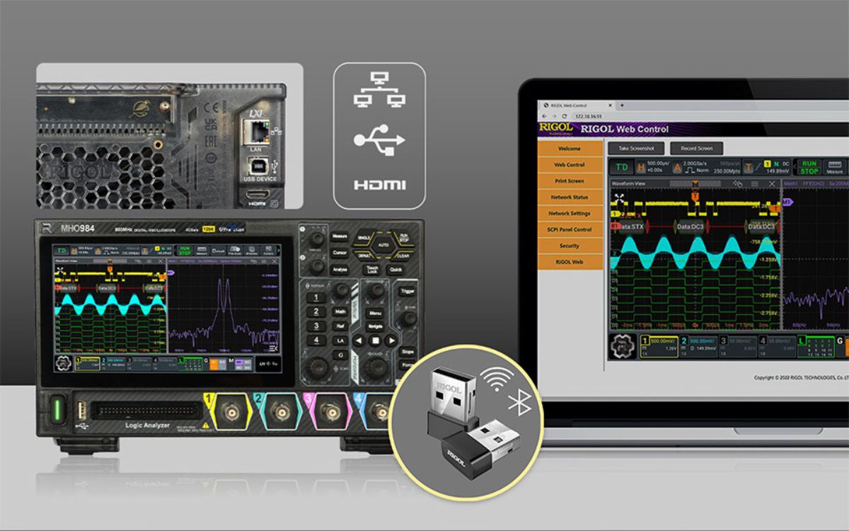 Осциллограф MHO900 оснащен стандартными адаптерами Bluetooth и Wi-Fi, что предоставляет инженерам возможность полного удаленного доступа к сети и управления. Это позволяет проводить автоматизированное тестирование без присутствия оператора или осуществлять мониторинг данных на большом расстоянии, значительно повышая эффективность и безопасность работ. Подключение по Bluetooth расширяет возможности использования периферийных устройств без занятия физических портов, устраняя необходимость в неудобных кабелях. Это готовое беспроводное решение создано для организации более чистого и современного рабочего пространства, позволяя вам сосредоточиться на анализе данных и технологических инновациях.