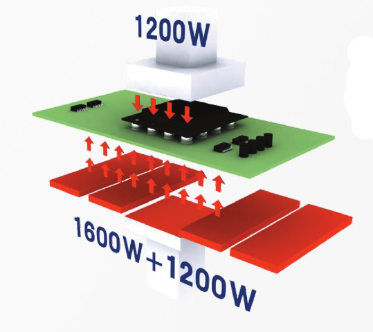 1. Два термовоздушных нагревателя: нижний и верхний (по 1200 Вт) каждый осуществляют быстрый равномерный нагрев зоны пайки