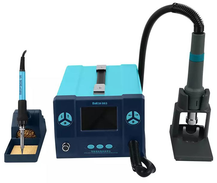 Паяльно-ремонтный комплекс Bakon BK863 объединяет в одном приборе традиционную паяльную станцию для контактной пайки и термовоздушную паяльную станцию для компонентов SMD. Паяльно-ремонтный комплекс Bakon BK863 превосходно подходит как для монтажа, так и для демонтажа большинства компонентов. Оба модуля имеют индивидуальные выключатели питания и могут быть использованы как самостоятельно, так и совместно. По своим параметрам оставляет далеко позади станцию Lukey 852D.